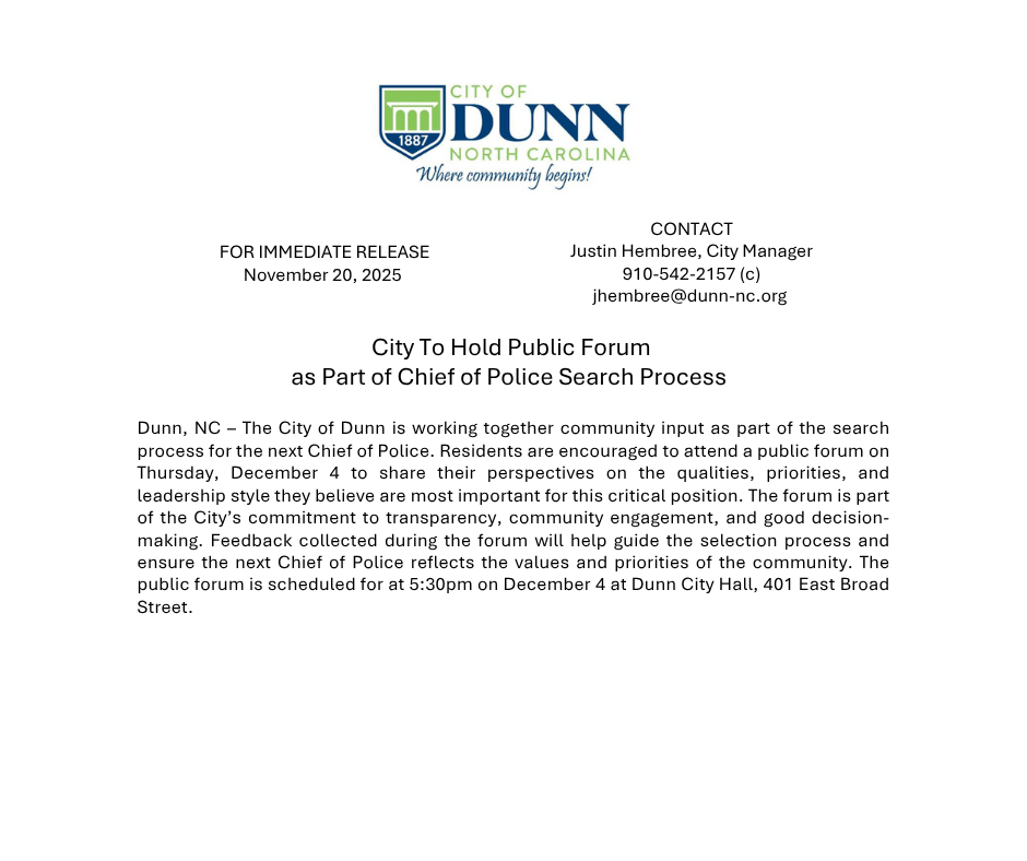 The City of Dunn has launched a public survey to gather community input as part of the search for the next Chief of Police. City residents are invited to share their perspectives on the qualities, priorities, and leadership style they feel are most important for this critical position.